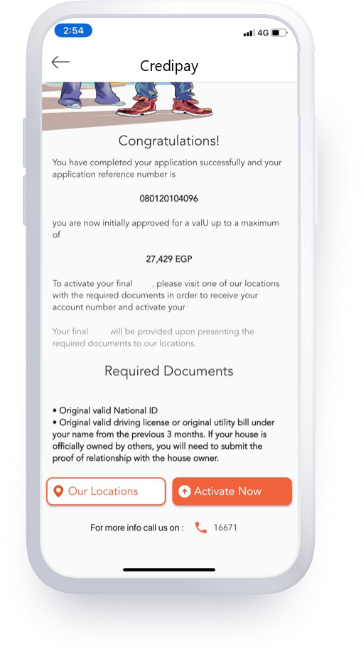 You can submit your documents at any one of our conveniently located activation points. If you are a credit card holder or have previously taken a loan, you receive an instant decision. If not, the app will list the next steps needed to get your Credipay.